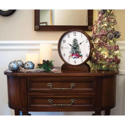 Delightfully festive! Solid hardwood case stained in walnut. Glass lens protects the oversize dial decorated in a holiday motif. Plays 12 beloved holiday tunes randomly per hour, from 8am to 11pm.* With back on/off switch to silence the songs if desired.