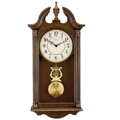 Hardwood case, warm brown cherry finish. Smaller scale classic split pediment design with full crown returns. Vienna-style metal dial with Arabic numerals and full lyre pendulum. Bulova Harmonic triple-chime movement plays choice of Westminster, Ave Maria or Bim-Bam melody on the hour. Quarter-hour Westminster chime and strike available. Adjustable volume control. Automatic night shut off switch available.