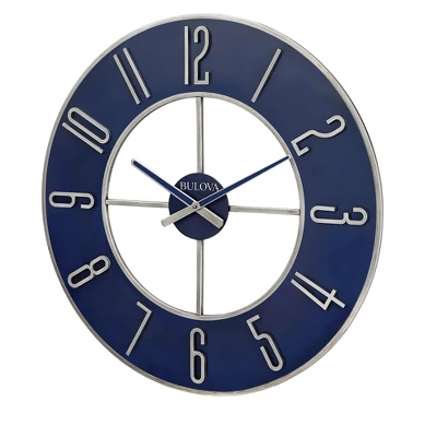 Thoroughly modern time Oversize matte silver-tone metal case and raised laser-cut contemporary Arabic numerals against a steel blue dial track. Requires (1) AA battery, not included. Dia.: 27” D: 2” 68.5cm Dia. X 5cm D