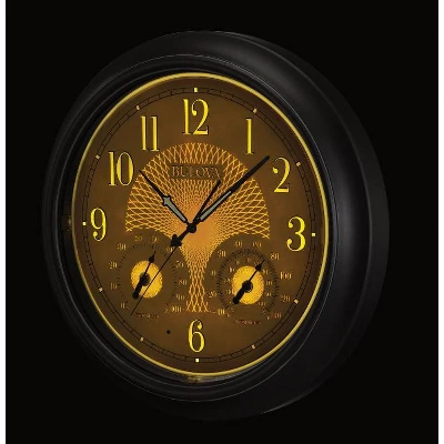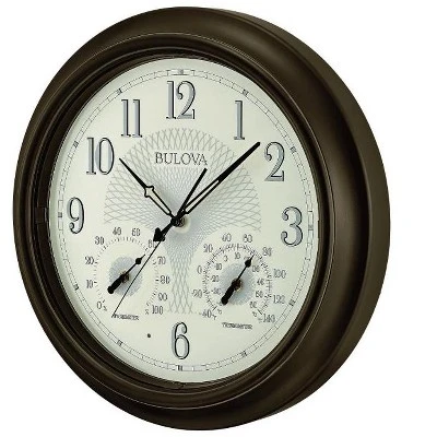 Illuminated outdoor wall clock with a two-step metal case in oil rubbed bronze finish. The movement is sealed with a gasket for protection from outdoor elements. Arabic numerals and instrument graphics are printed with a light reflective ink, then covered with a clear acrylic diffusing overlay. Four strategically placed battery-powered LED lights, controlled by a light-sensor, illuminate at dusk and keep the dial visible until automatically shutting off at dawn. The hour and minute hands are luminescent for 24-hour viewing. Includes a thermometer with Fahrenheit and Celsius scales and a hygrometer, both also legible at night, as well as a protective gasketed glass lens.