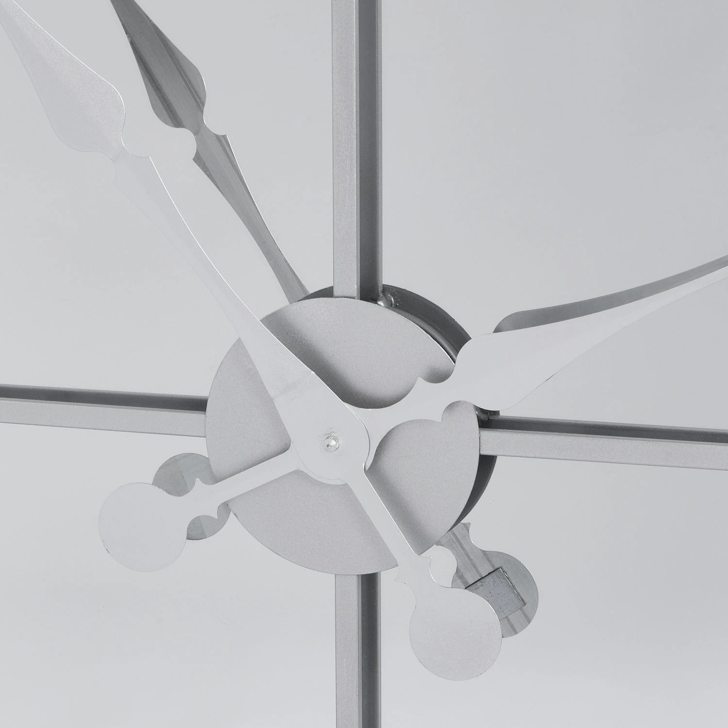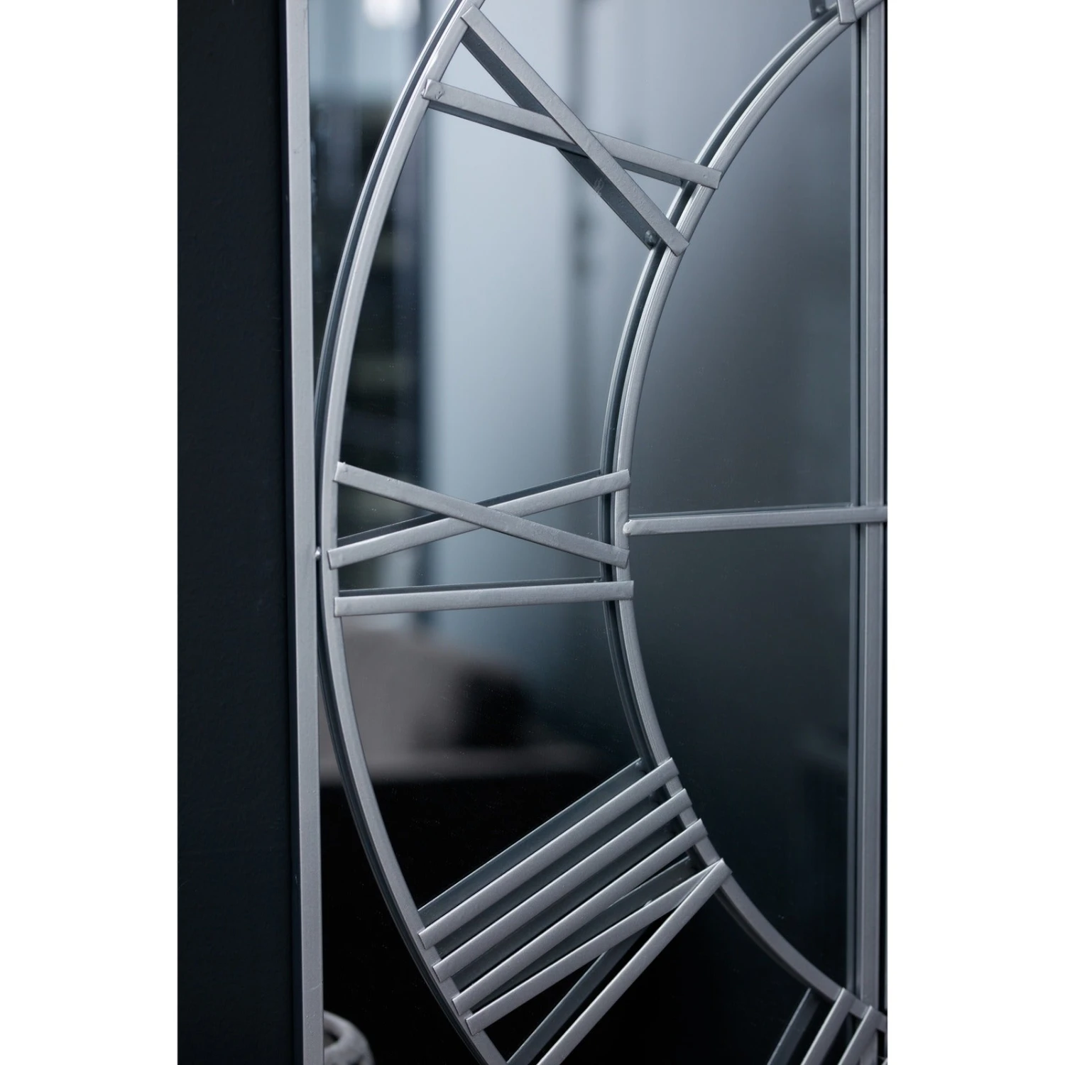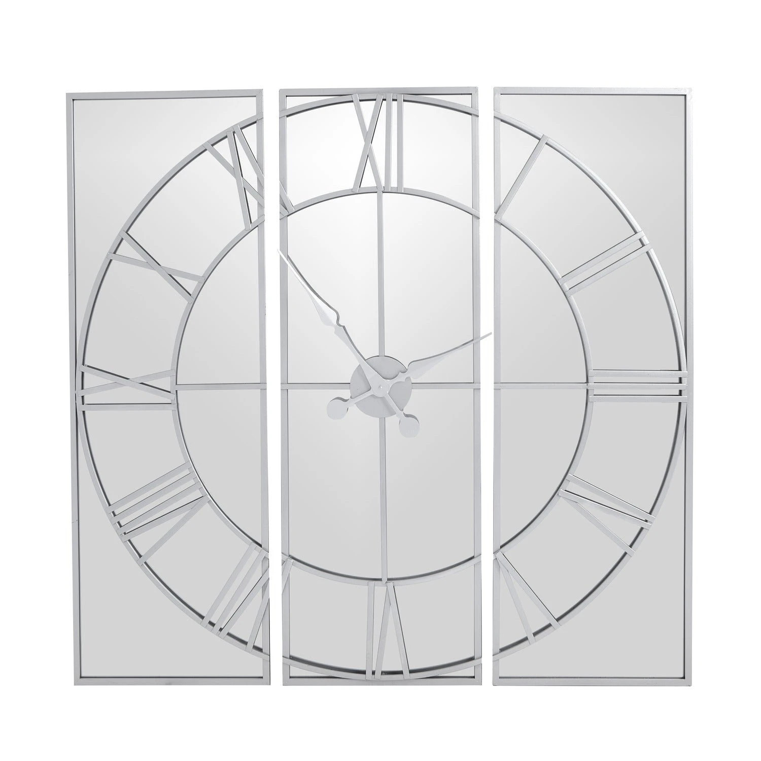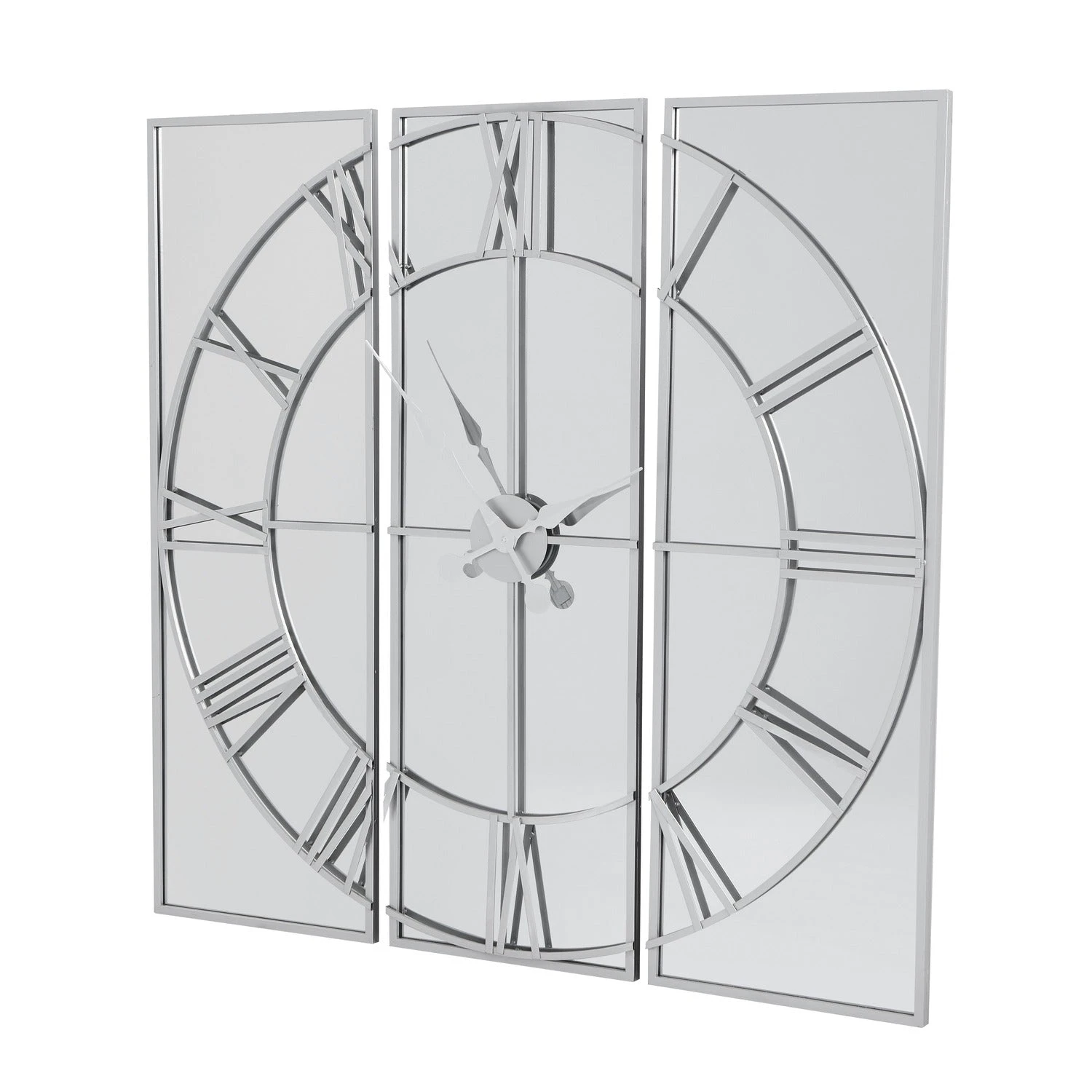 Showcasing a silver skeleton-style clock face set against a mirrored backdrop, this striking three-piece design fuses contemporary elegance with timeless charm. The segmented layout creates depth and visual interest, while the reflective surface enhances light and the sense of space. Roman numerals and a sleek silver finish lend a modern-industrial edge, perfect for chic lofts and stylish living areas.