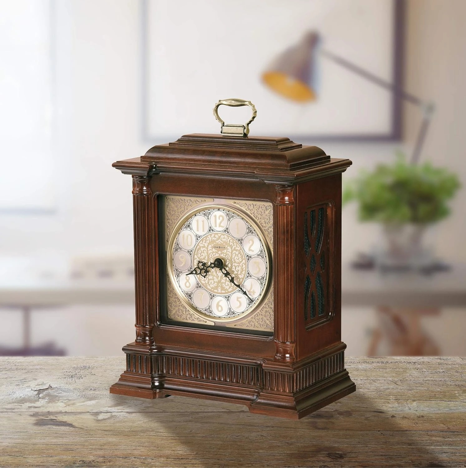 - DURABLE, The durable build of this antique clock will relieve stress at home. Enhanced with applied brass-finished, etched fret center disk and corner ornaments, the decorative dial of this rustic clock catches eyes instantly. The added brass-finished bezel and a silver numeral ring with a black floral pattern add more detail.