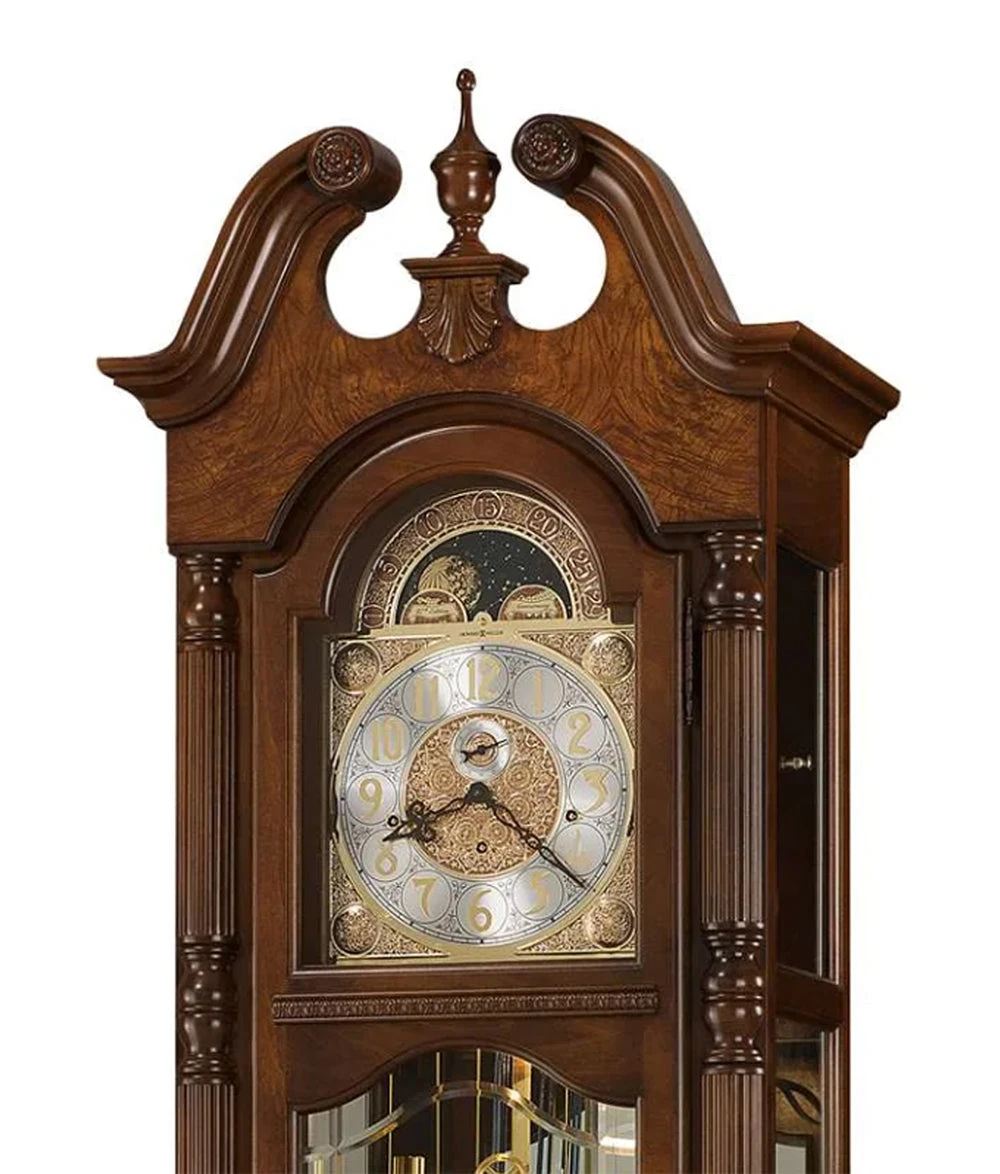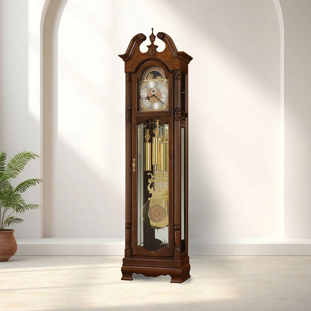 Explore the Howard Miller Baldwin Grandfather Clock, distinguished by its traditional swan-neck pediment, brass-finished dial, and cable-driven Westminster chimes. This expertly crafted timepiece embodies the enduring quality and elegance expected in classic interior settings.