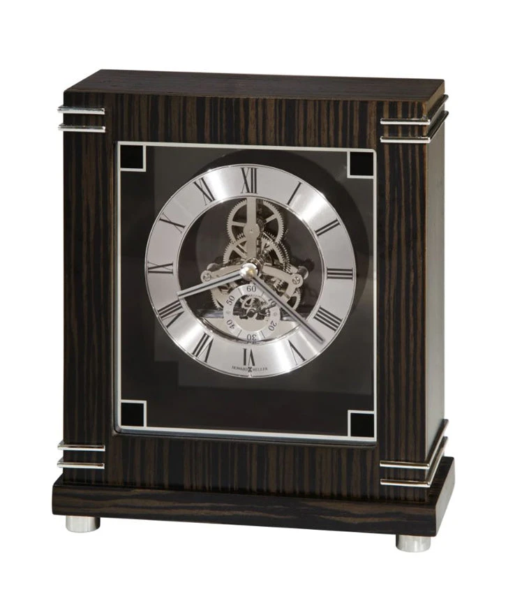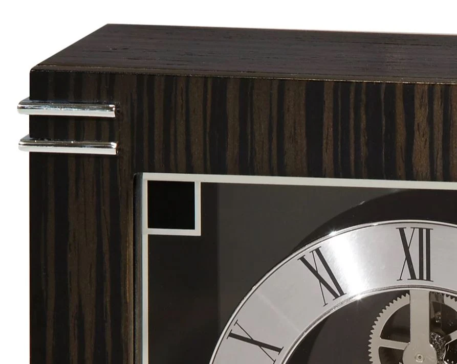 Handsome Macassar ebony finished mantel clock with bold polished silver-finished accents and round satin silver-tone feet.