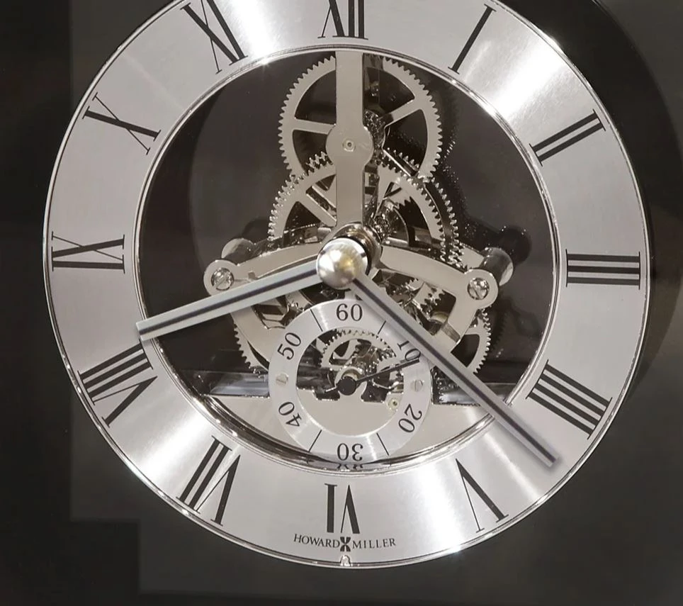 - The dial features a brushed silver-tone numeral ring with black Roman numerals surrounding a polished silver-finished skeleton movement; separate seconds track above the “6” position; and silver hands with a black stripe, all behind flat glass with silver and black accents.