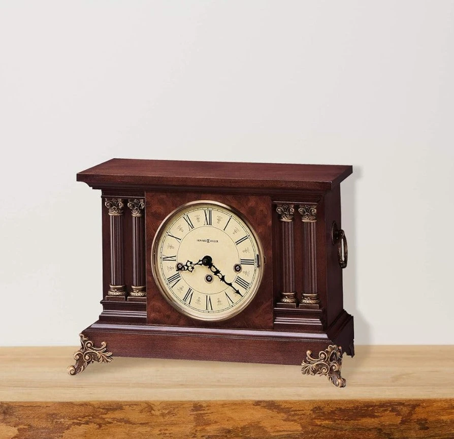 - DURABLE: This clock has a sturdy frame to relieve stress in a busy household. This timepiece has traditional Roman numerals (IIII instead of IV) to stand out over the aged dial, veneer on the front resembles Carpathian elm burl, front and rear feet, and decorative reed columns.