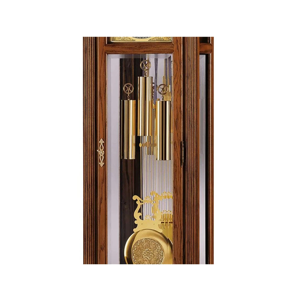 Detailed Design: Howard Miller offers a detailed design with this wooden grandfather clock. The polished brass-finished dial offers elaborate corner spandrels, a center disk with an astrological blue moon phase, and a silver chapter ring with applied brass Arabic numerals. A glass mirrored back highlights the polished brass-finished pendulum with a decorative center disk and polished brass-finished weight shells. The case also features a mirrored back to showcase items from all angles.
