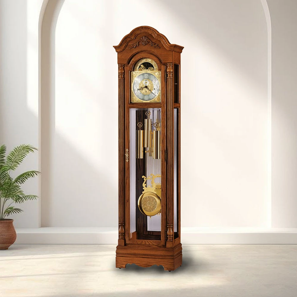 Clock Design: This wooden grandfather clock is finished in Oak Yorkshire on select hardwoods and veneers. The clock features a traditional arched bonnet pediment highlighted by a decorative shell and vine overlay. Reeded columns with turned top and bottom caps add an elegant touch, and the decorative cut-out on the sculpted base completes the picture. Beveled glass gleams on the locking lower door. The cabinet is illuminated by an interior light, and the clock is equipped with adjustable levelers under each corner.