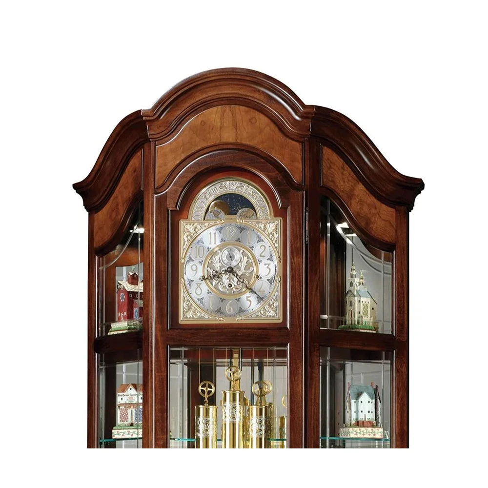 - Cherry-Finish Hardwoods: This wooden grandfather clock was designed and crafted in the USA from select hardwoods and veneers. A Windsor Cherry finish and arched pediment impart a stately style to this functional accent.