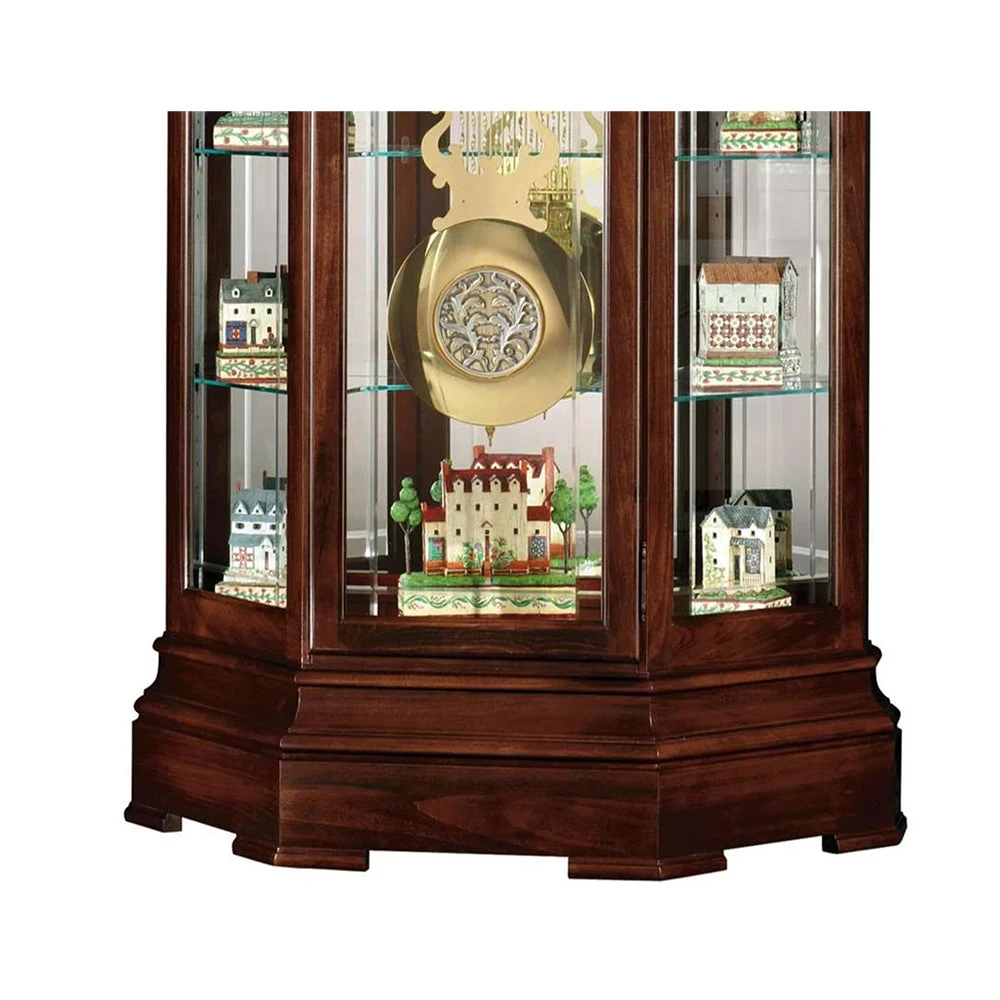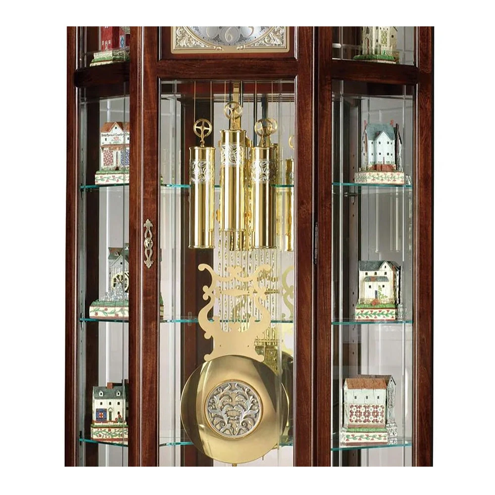 - Spacious Shelves: A brass-finish pendulum and weight shells sit in the center of this curio clock. This timepiece also has six glass shelves—three of which can be adjusted to accommodate your collectibles. The case also features a mirrored back and bottom to showcase items from all angles.
