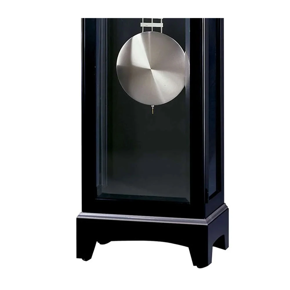 Careful Craftsmanship: This black grandfather clock by Howard Miller is finished in Black Satin on select materials, hardwoods, and veneers. This unique piece boasts simple, contemporary elegance. Simple lines best describe the clock’s case, which offers a flat-top pediment with a nickel finished molding.