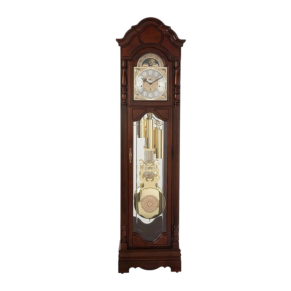 - Refined Details: Brass-finish Arabic numerals adorn the polished brass-finish dial of this wooden floor clock. A moon phase and star illustration appear at the top of the dial, which is also decorated with intricately detailed corner spandrels and an ornate center disk. Inside the case are a brass-finish pendulum and weight shells for timeless sophistication.