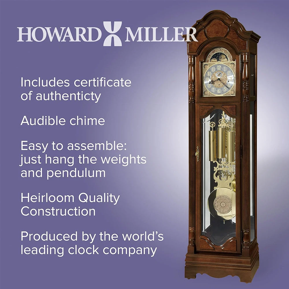 The Howard Miller Wilford Grandfather Clock, crafted in a rich Cherry Bordeaux finish with cable-driven Westminster chime movement. This classic Howard Miller Grandfather Clock blends timeless design with heirloom quality. Ideal for elegant interiors.