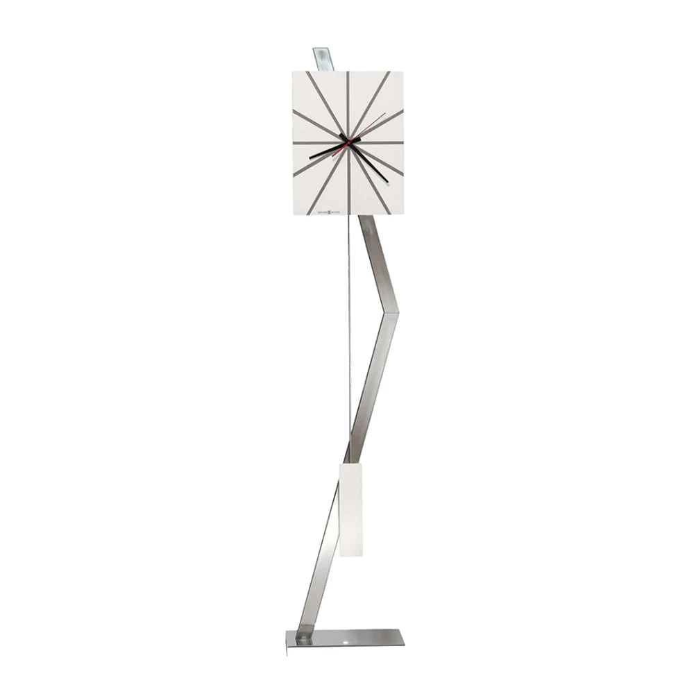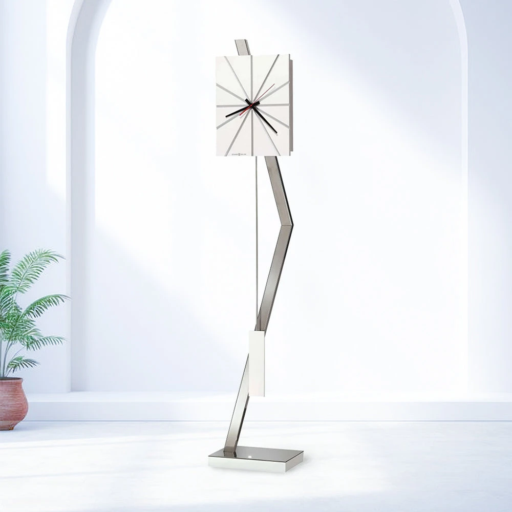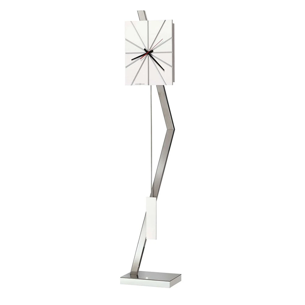 - This grandfather clock features a unique modern design with a rectangular dial finished in Gloss White and chrome-finished hour markers in the background in a sunbeam pattern.