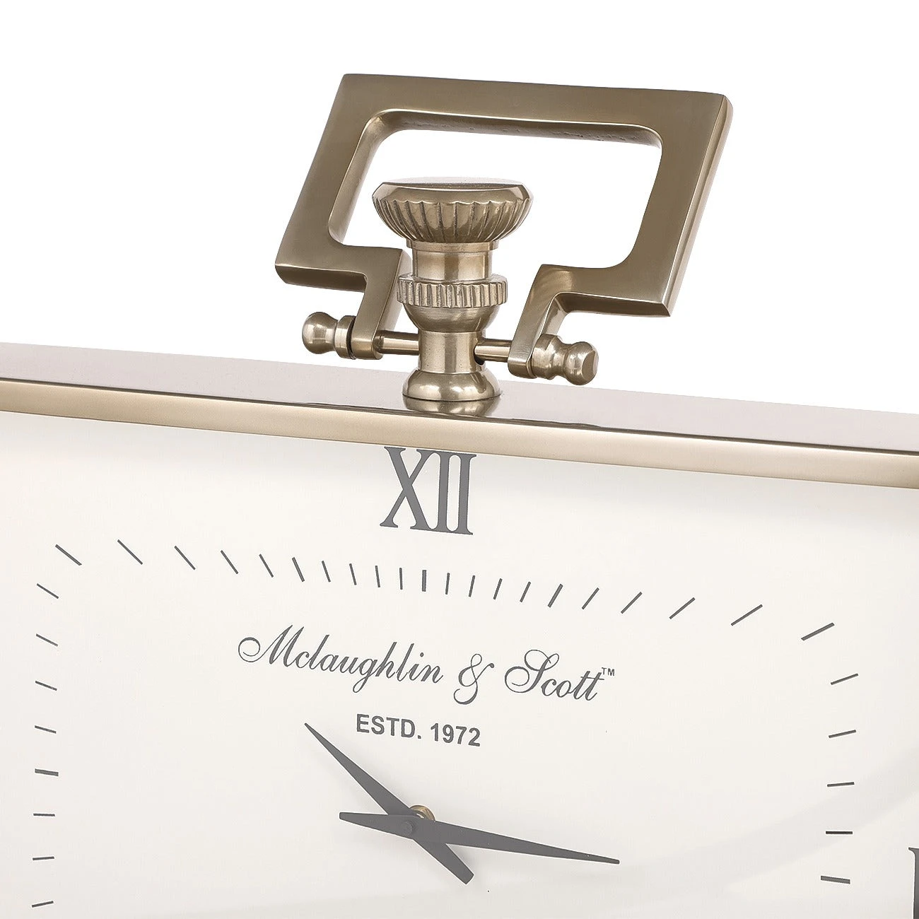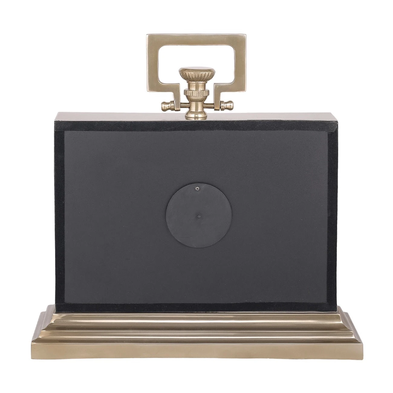 Crafted from metal with a brushed brass finish, this sophisticated piece captures the essence of a classic pocket watch reimagined for the modern interior. Its rectangular form, bold Roman numerals, and stepped base create a striking silhouette, while the crisp white face keeps the design clean and balanced.