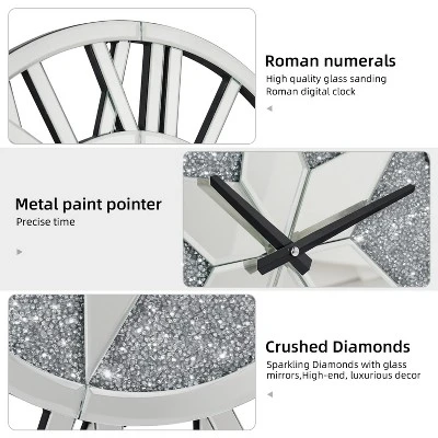 - 【Beautiful Wall Clock】Not only used as a normal clock for time-measuring, but treated as a vibrant art decoration, it is beautifully adorned with silver glass mirrors and bling crush diamond, visually aesthetic to enhance the decor of any home interiors, versatile elements that enliven any space, no matter the design style