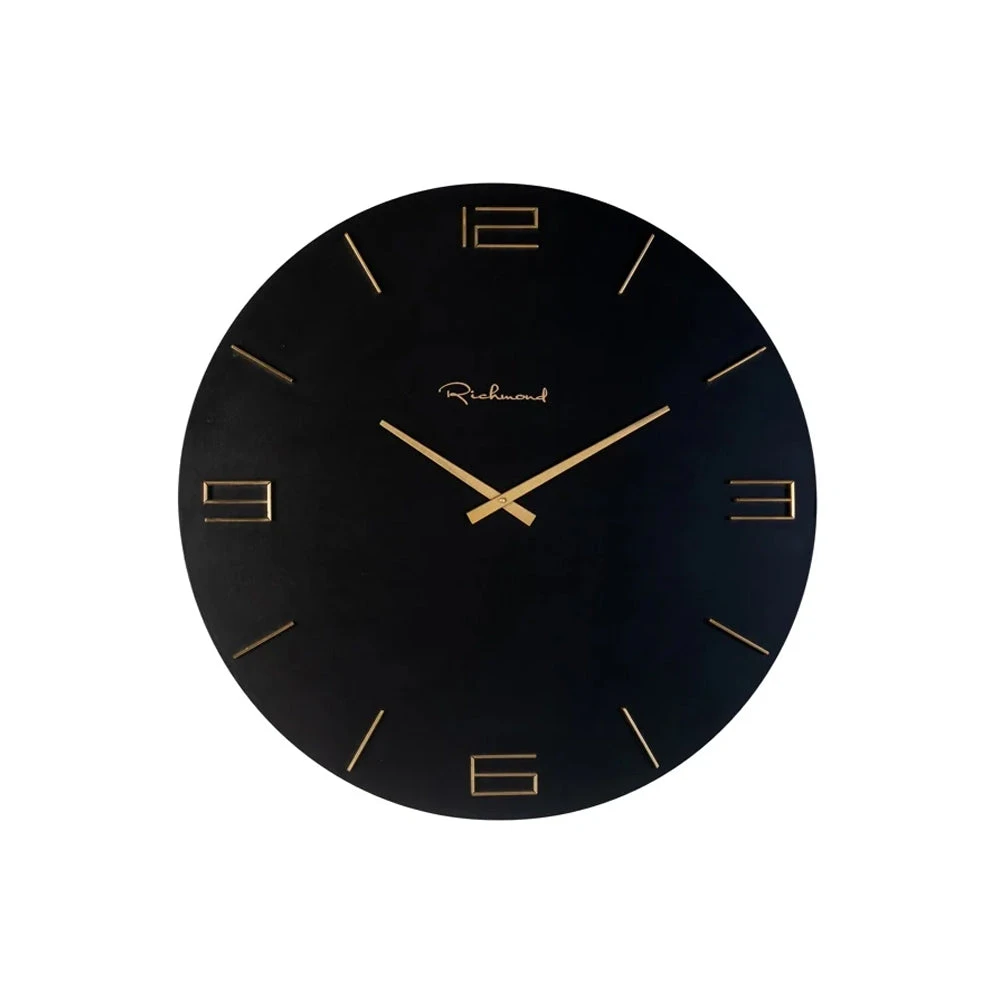 Featuring a black clock face adorned with brass numbers and lines marking the hours, this clock boasts a clean, uncluttered aesthetic whilst the brass hands add a sophisticated touch, making it a perfect addition to any contemporary or modern interior.