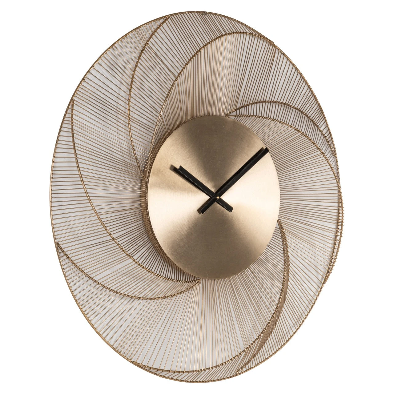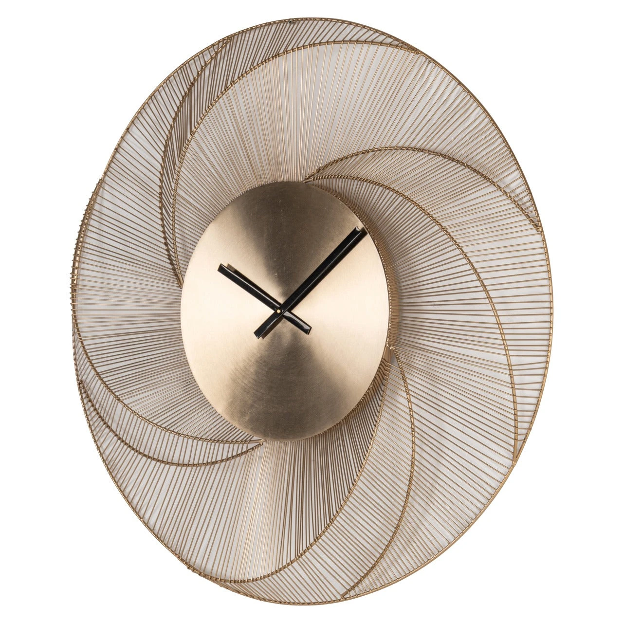 Crafted from gold-finished iron and MDF, this distinctive wall clock features a captivating spiral wire frame that catches the eye while adding depth and texture to your space. Its minimalist face and sleek black hands stand out beautifully against the radiant metallic backdrop, creating a look that feels both refined and dramatic.