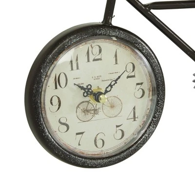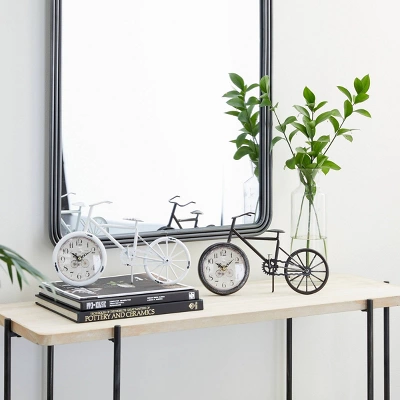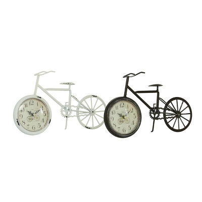 Improve your time management skills and keep a clock close by with this charming piece. A dashing display on any surface to help you manage your time throughout the day. Add some playful element in your country cottage home with these bicycle table clocks in your living room and bed room for an energizing, and punctual vibe everywhere you go. Requires 1 AA battery each. Batteries not included. This item ships in 1 carton. The clock face features black iron clock hands and distressed Arabic numeral. The clock mechanism runs silent. Propped up by kickstands. Iron clock makes a great gift for any occasion. Suitable for indoor use only. This item ships fully assembled in one piece. This multi colored mantel clock comes as a set of 2. Country Cottage style.