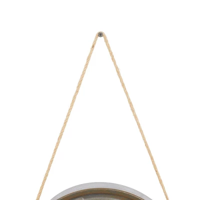 - Features round clock faces with white and black numerical markings, designed with distressed beveled frames attached with brown jute rope hangers